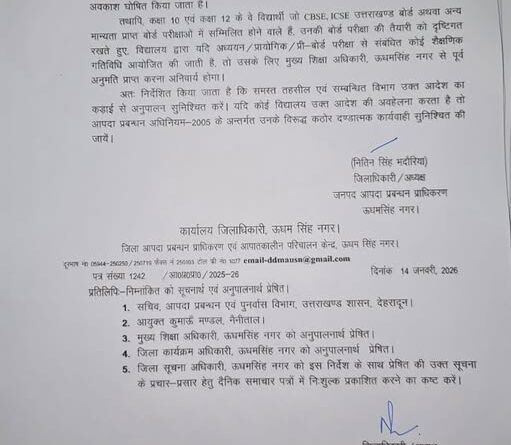 शीतलहर की गंभीर स्थिति के पूर्वानुमान को देखते हुए जिलाधिकारी, ऊधमसिंह नगर द्वारा जनपद में एहतियातन महत्वपूर्ण निर्णय लिया गया है। जिलाधिकारी के आदेशानुसार जनपद के समस्त आंगनबाड़ी केंद्रों एवं कक्षा 1 से 12 तक के सभी सरकारी, अशासकीय एवं निजी विद्यालयों में दिनांक 15 जनवरी से 17 जनवरी 2026 तक अवकाश घोषित किया गया है।