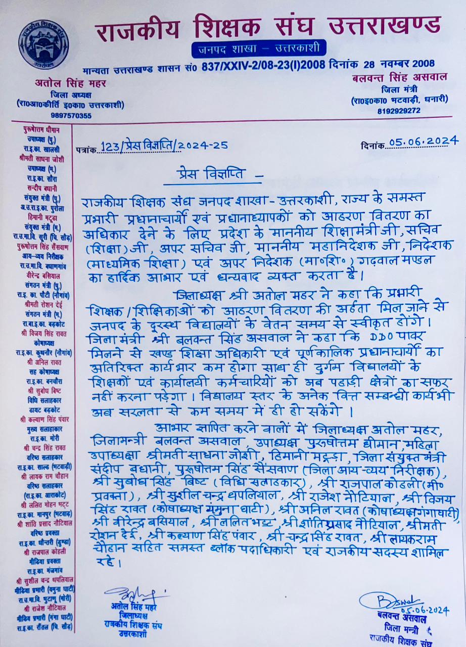 दूरदराज़ क्षेत्रों में अध्यापन कार्य कर रहे समस्त प्रभारी साथियों को आहरण अधिकार प्रदान करने से अब वेतन आहरण के लिए स्कूलों के शिक्षकों/ कर्मचारियों को कई किलोमीटर का सफर नही करना पड़ेगा। अब समय से ही सभी का वेतन एवं अन्य वित्त संबंधी कार्य आसानी से हल होंगे। आहरण वितरण का अधिकार हमारे सम्मानित प्रभारी साथियों को प्रदान करने से हम सभी राजकीय सदस्य बेहद खुश हैं। उत्तरकाशी के सभी संघ पदाधिकारियों एवं शिक्षकों द्वारा माननीय शिक्षा मंत्री डॉ धन सिंह रावत , विभागीय अधिकारीयों शिक्षा सचिव, महानिदेशक, अपर सचिव, निदेशक माध्यमिक शिक्षा, एवं अपर निदेशक माध्यमिक शिक्षा का हार्दिक आभार एवं धन्यवाद व्यक्त किया गया।